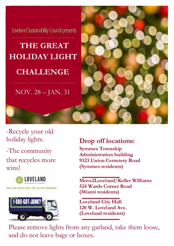 The Loveland Sustainability Council is promoting The Great Holiday Light Challenge, a friendly competition held annually among City of Loveland, Miami Township, and Symmes Township. Residents are encouraged to recycle their used holiday lights Nov. 28 – Jan. 31 at the following locations: